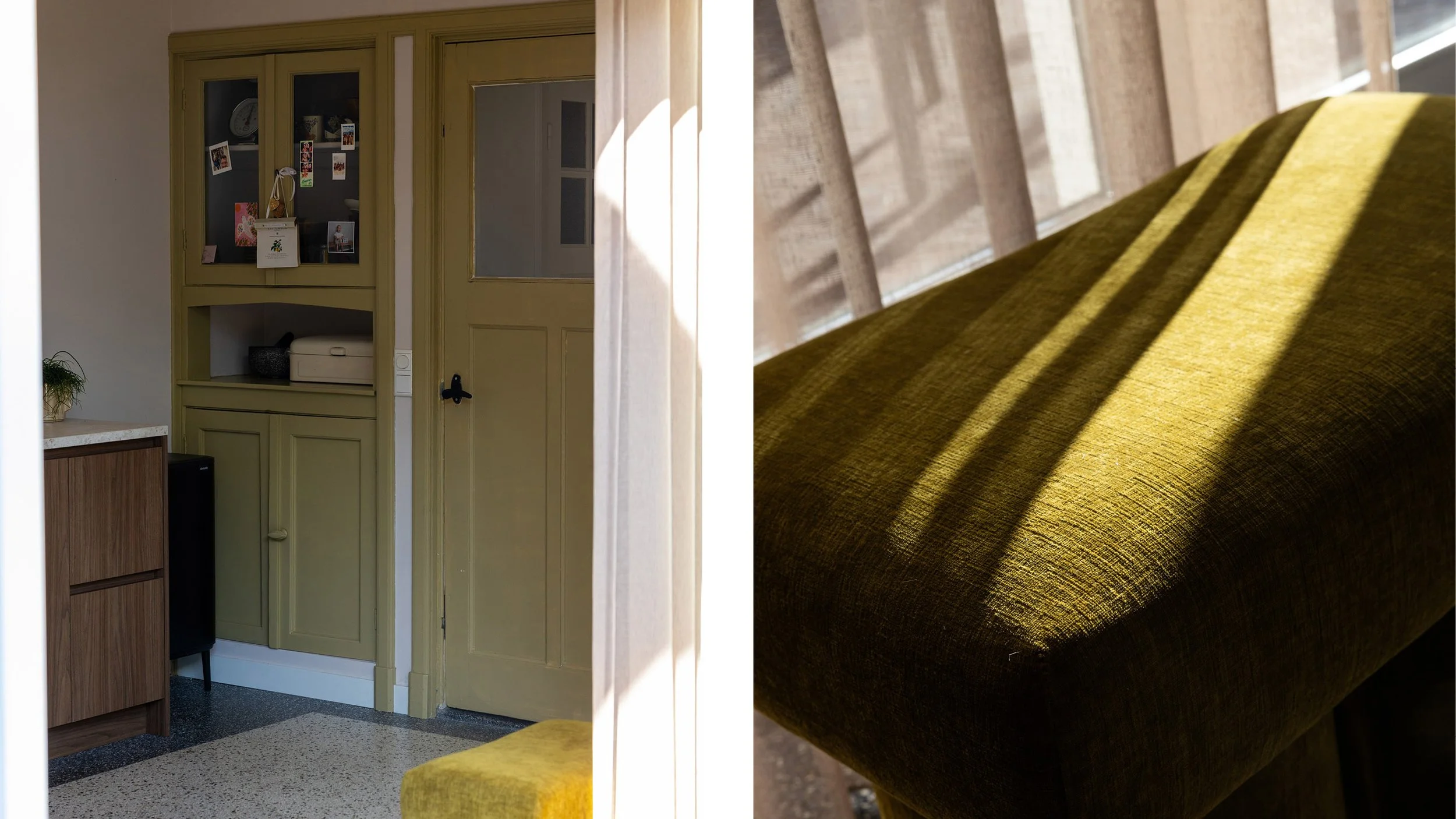 De keuken, uitgevoerd in warm notenhout, staat op een nieuwe terrazzovloer die naadloos aansluit bij het oorspronkelijke karakter van de jaren ’30-woning. Zachte kleuren, natuurlijke materialen en sfeervolle verlichting maken het geheel tot een harmonieuze leefruimte waarin koken, ontmoeten en samenzijn centraal staan.